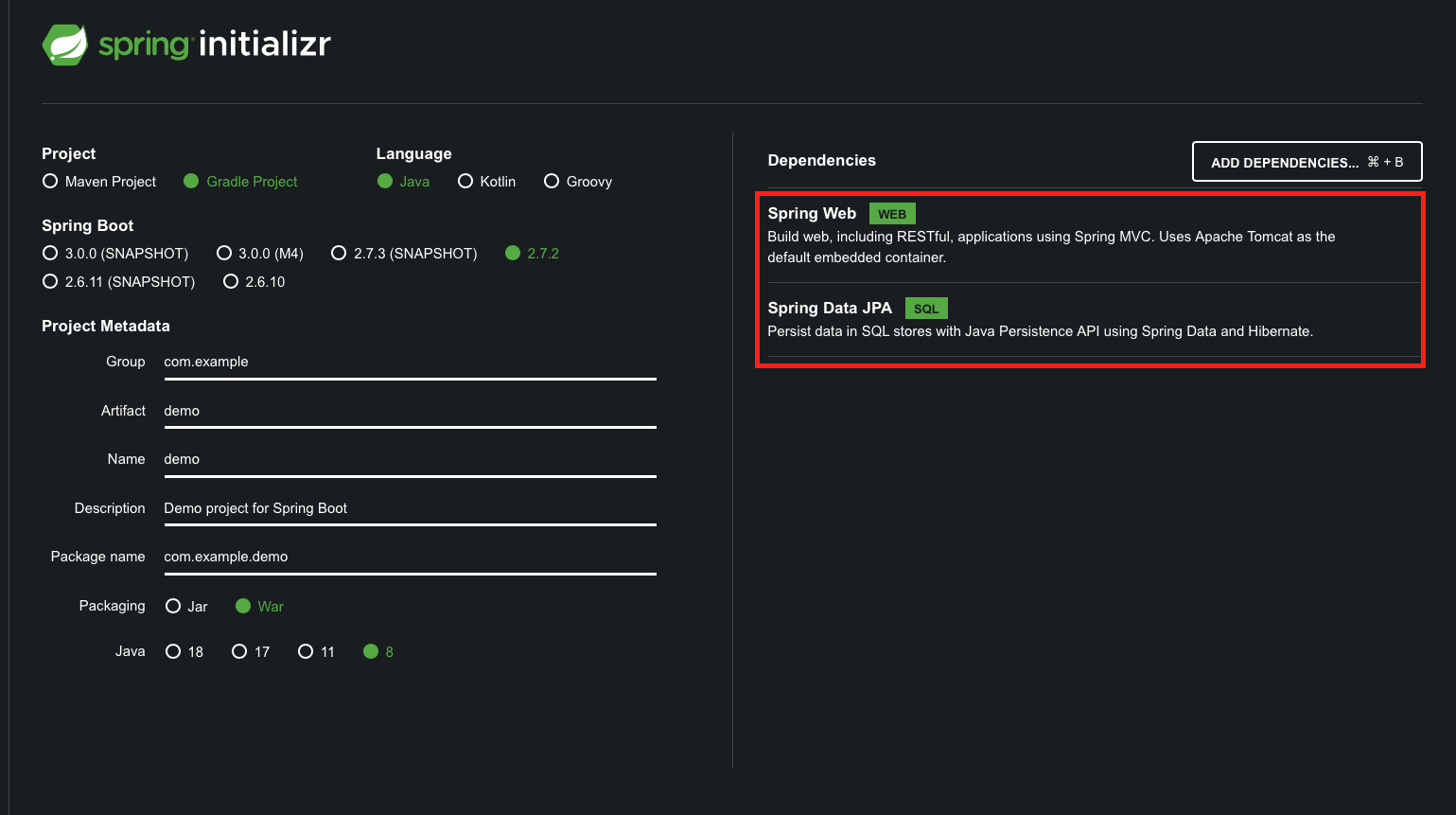 Dependencies 에 Spring Web, Spring Data JPA를 추가해 주면 됩니다.
