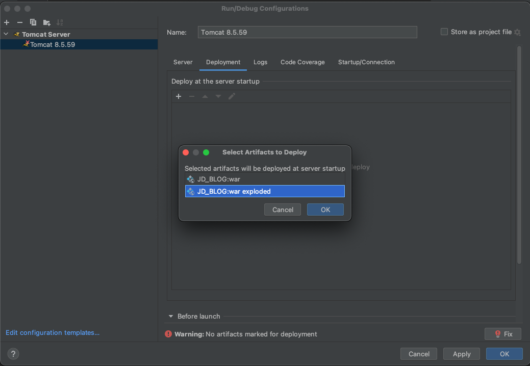 Deployment탭에서 +를 누르고 artifact를 추가해 줍니다. xxxxx:war exploded 형식을 선택해 주면됩니다.