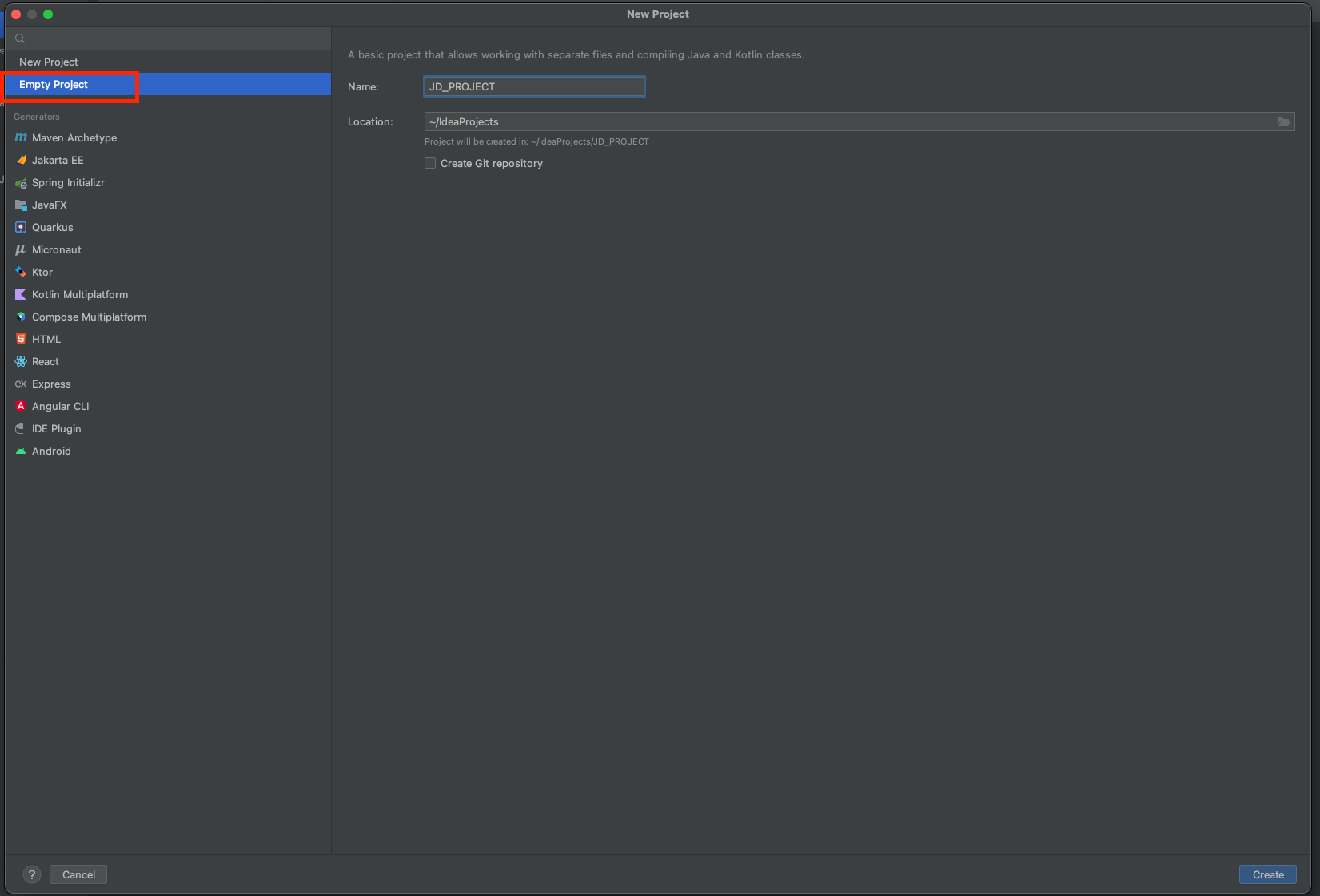 New Project를 선택한 후, Empty Project를 생성해줍니다.