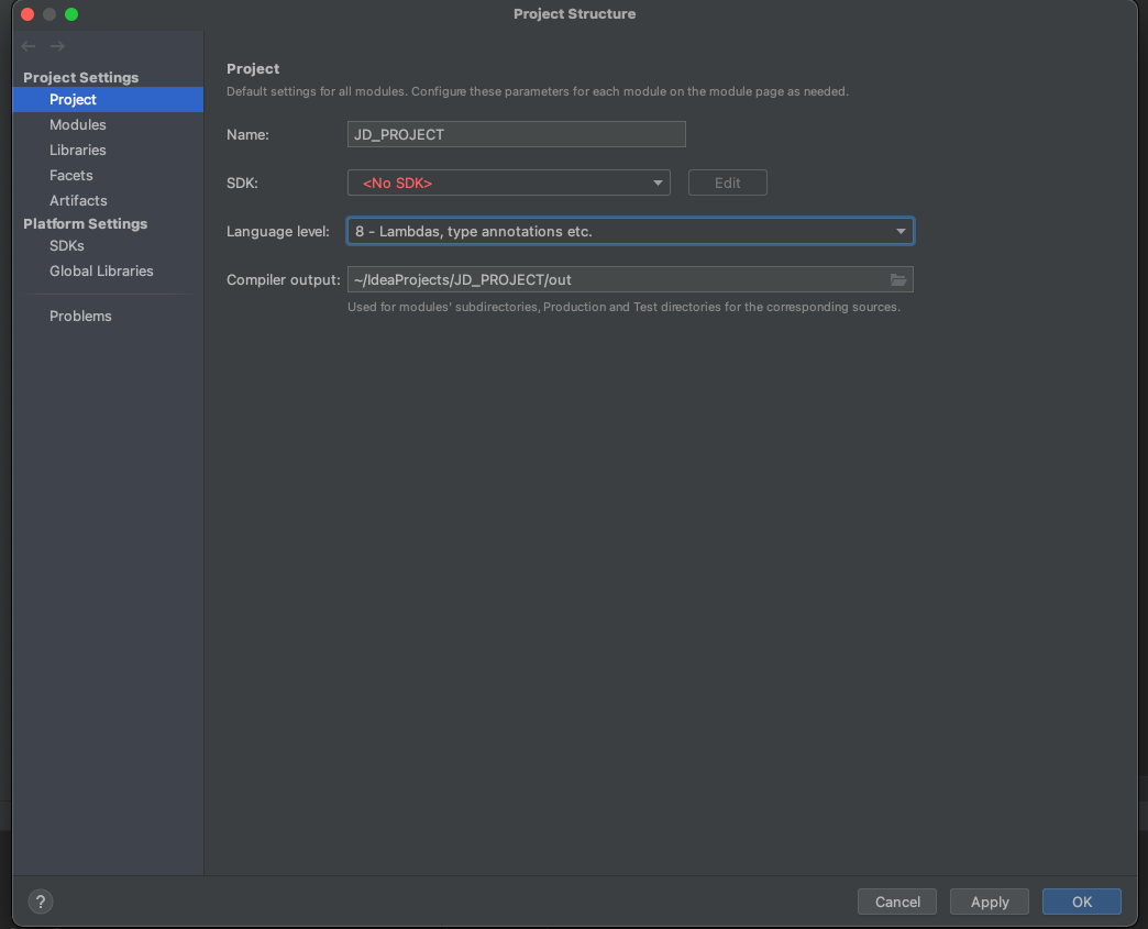 File -> Project Structure 메뉴를 선택하여 프로젝트에서 사용할 자바 버전을 선택합니다.