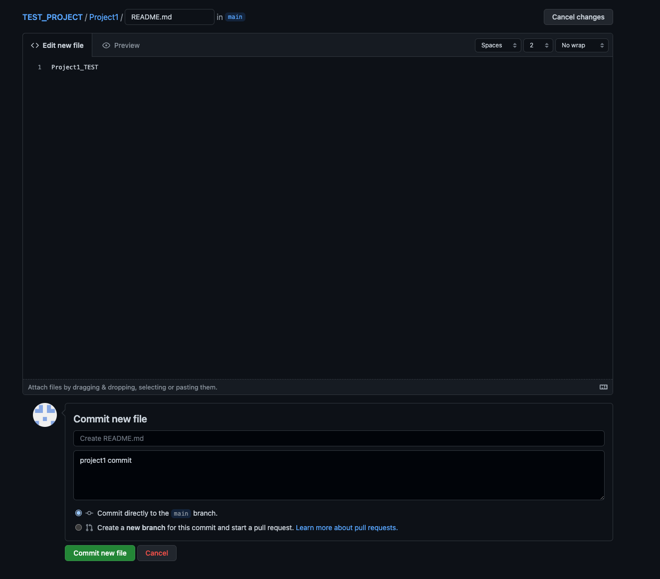 위와 같이 Project2/README.md 경로를 입력하여 주고, 나머지 정보들을 입력 후 Commit new file을 클릭해줍니다.
