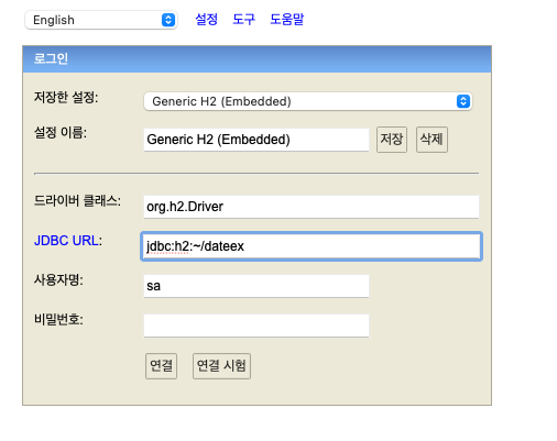 JDBC URL에 jdbc:h2:tcp://localhost/~/dateex 와 같은 형태로 입력해주고 연결하면 된다.