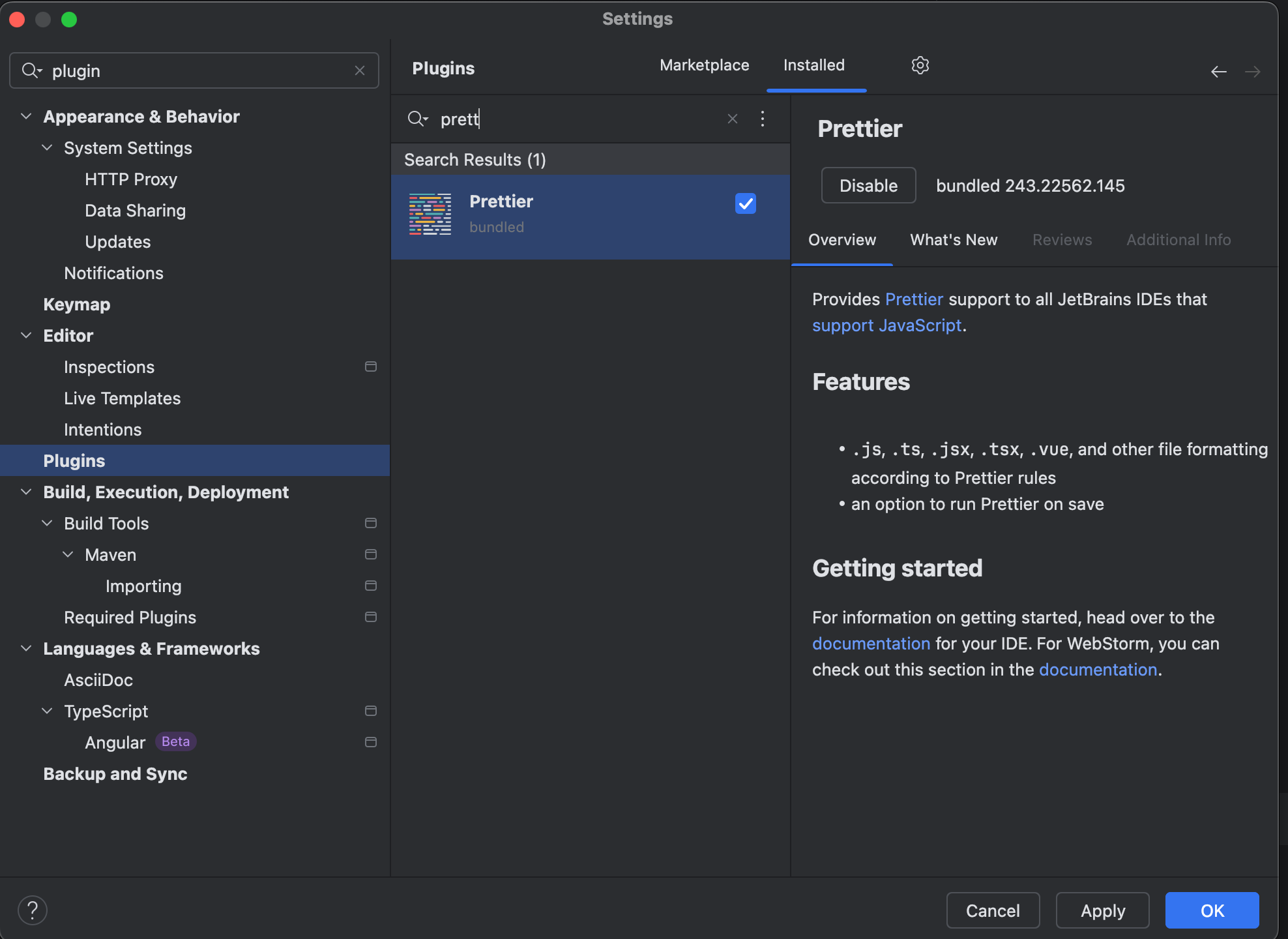 Prettier는 우선 플러그인을 설치해주어야 한다. 플러그인메뉴에서 Prettier를 검색해서 플러그인을 설치해준다.