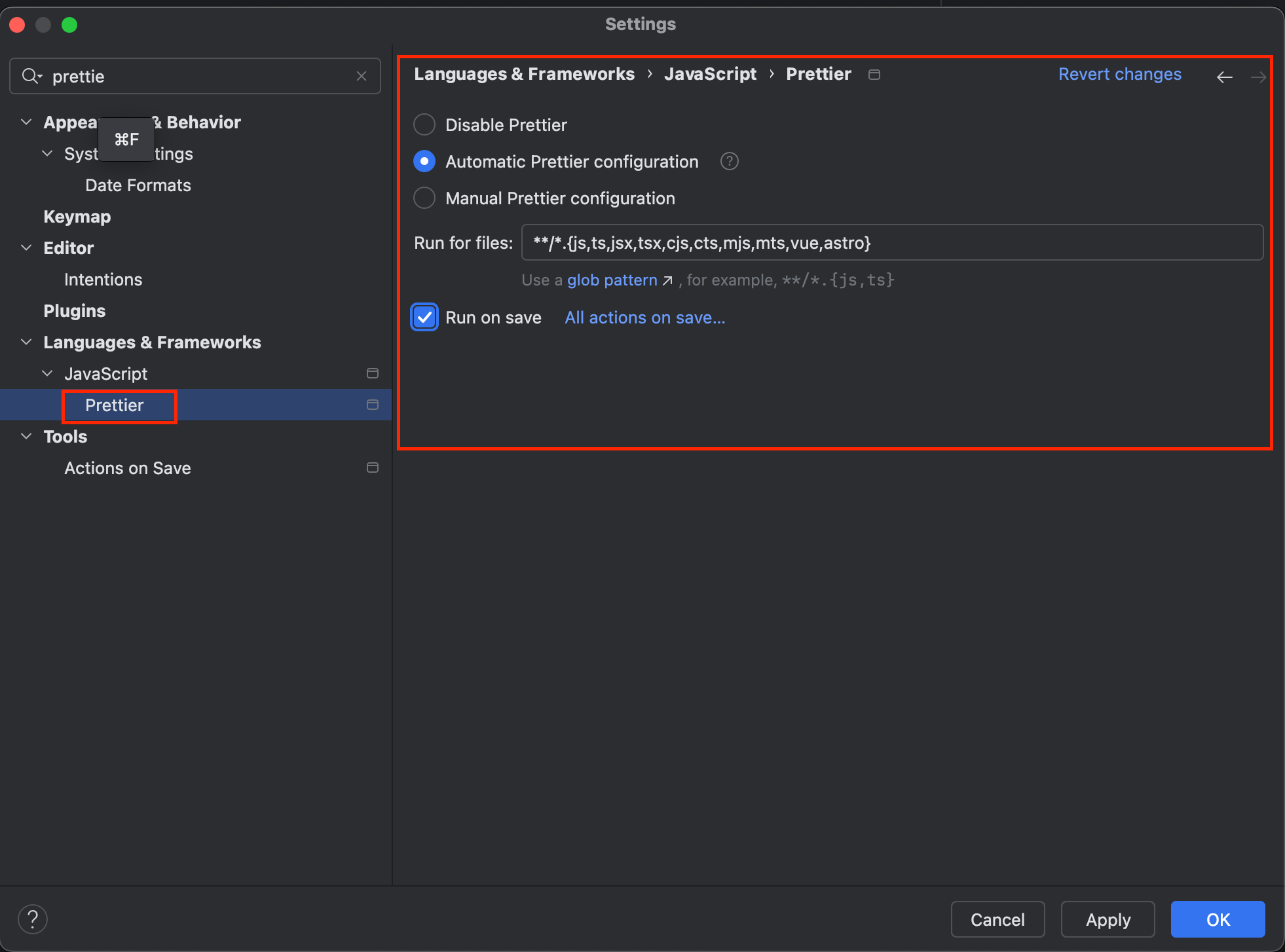 플러그인 설치 후, ESLint와 동일하게 Prettier메뉴에서 설정을 완료해준다.