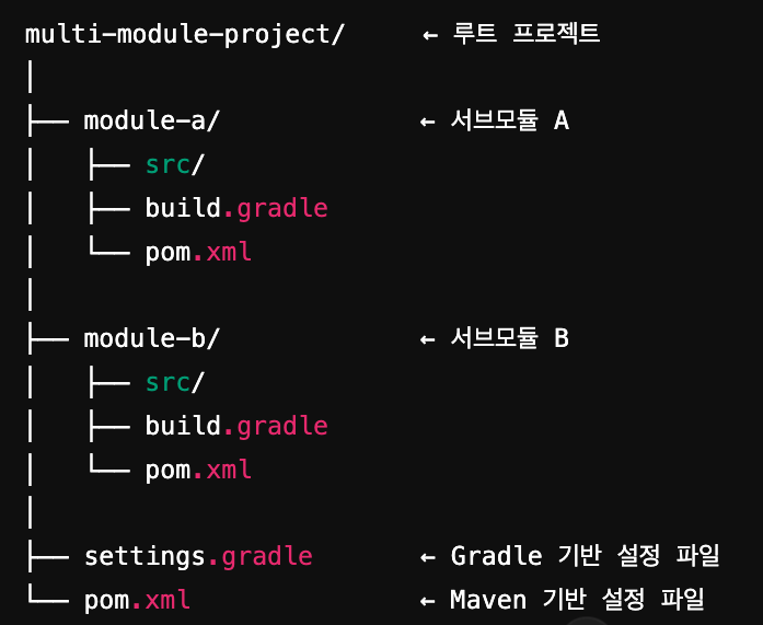 멀티모듈 프로젝트는 하나의 Root 프로젝트 아래에 여러개의 독립적인 서브모듈(SubModule)로 구성된 프로젝트 구조를 의미합니다.