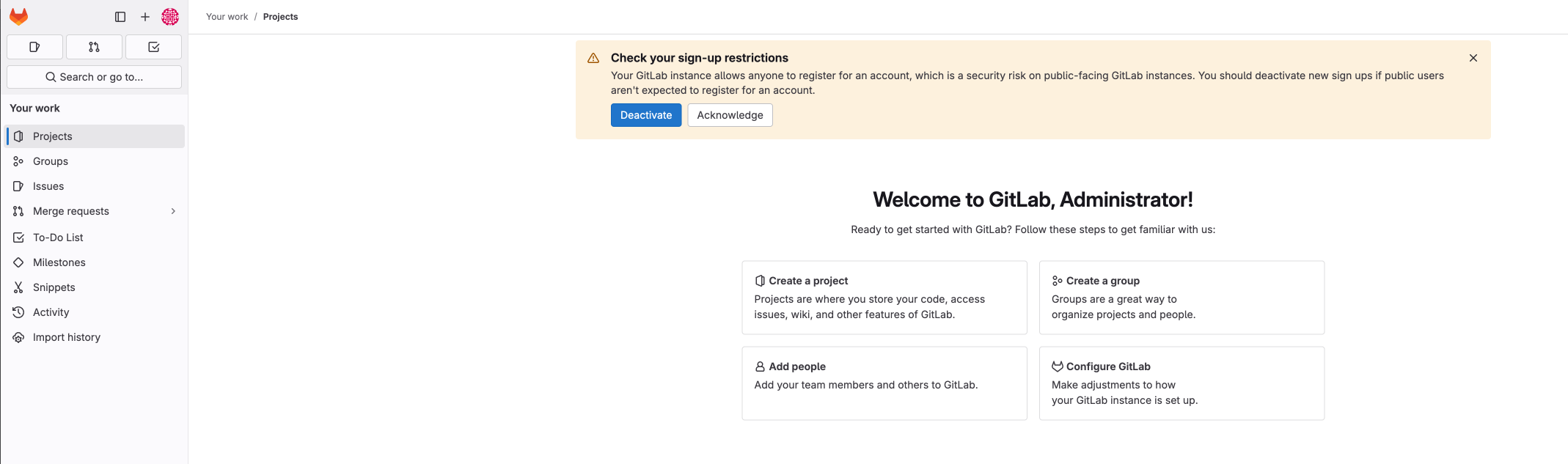 Sign in버튼을 누르면 정상적으로 GitLab메인화면을 확인할 수 있다.