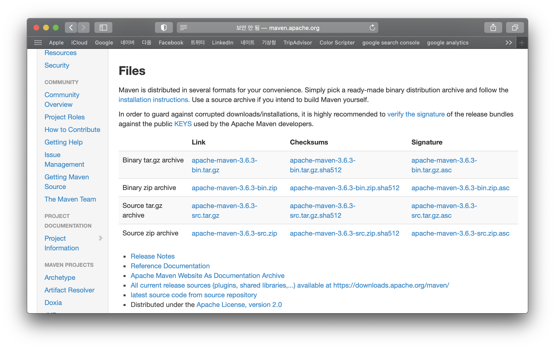 위와 같이 메이븐 페이지에 접속하여 Files 영역에서 Binary tar.gz archive파일을 다운받으시면 됩니다.
