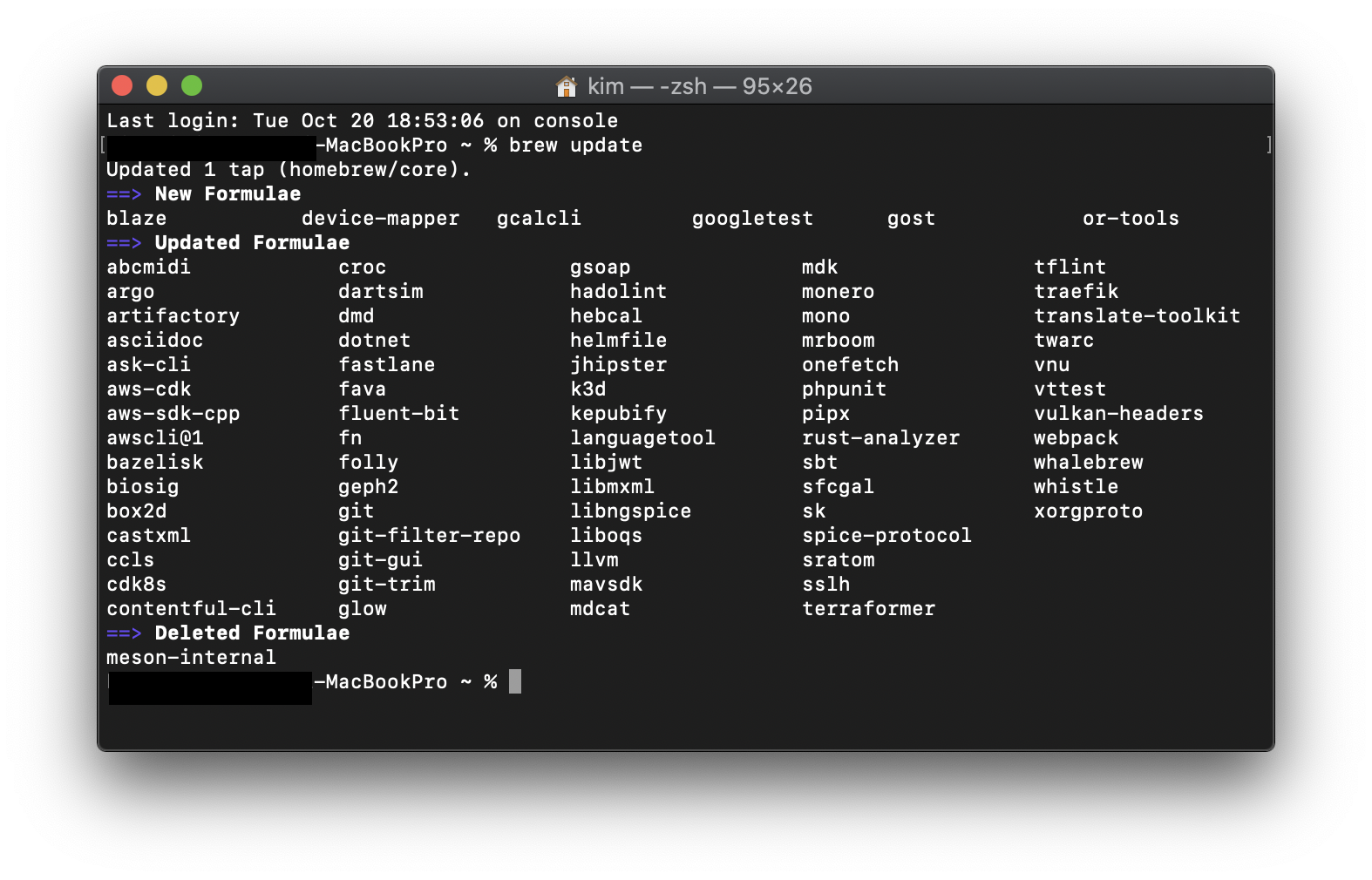 터미널을 실행시키고 제일 먼저 홈브루(Homebrew)의 상태를 최신버전으로 업데이트 해줍니다.