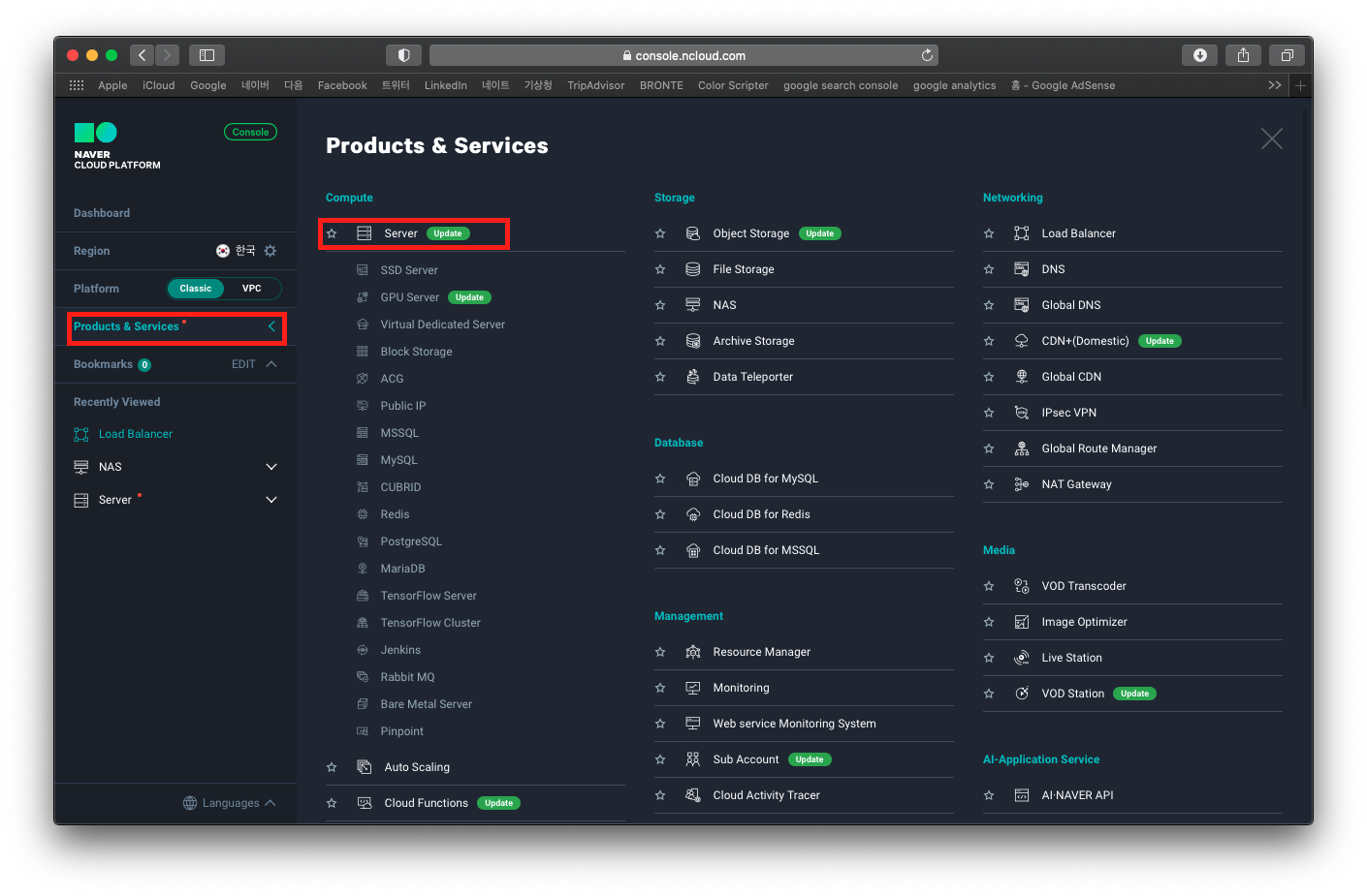 본격적으로 서버를 생성하기 위해 아래와 같이 products & services -> Server메뉴를 선택해 줍니다.