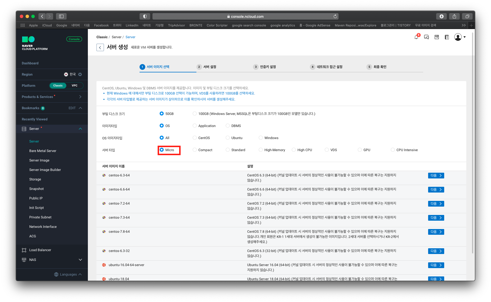 서버타입을 Micro로 선택하고, 나머지 옵션들은 원하는 유형의 스팩을 선택하여 서버를 생성하시면 됩니다.