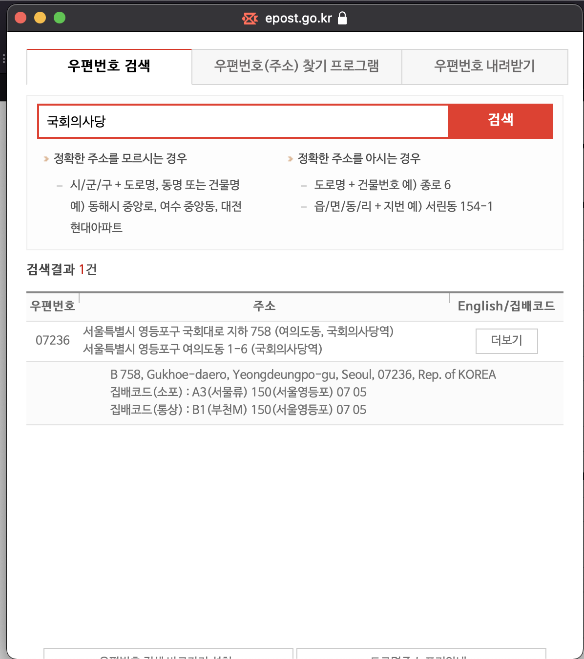 주소정보는 우체국 홈페이지에서 우편번호 찾기로 주소를 입력 후, english/집배코드에 더보기 버튼을 누르고 나온 정보를 입력하시면 더 쉽게 입력이 가능합니다.