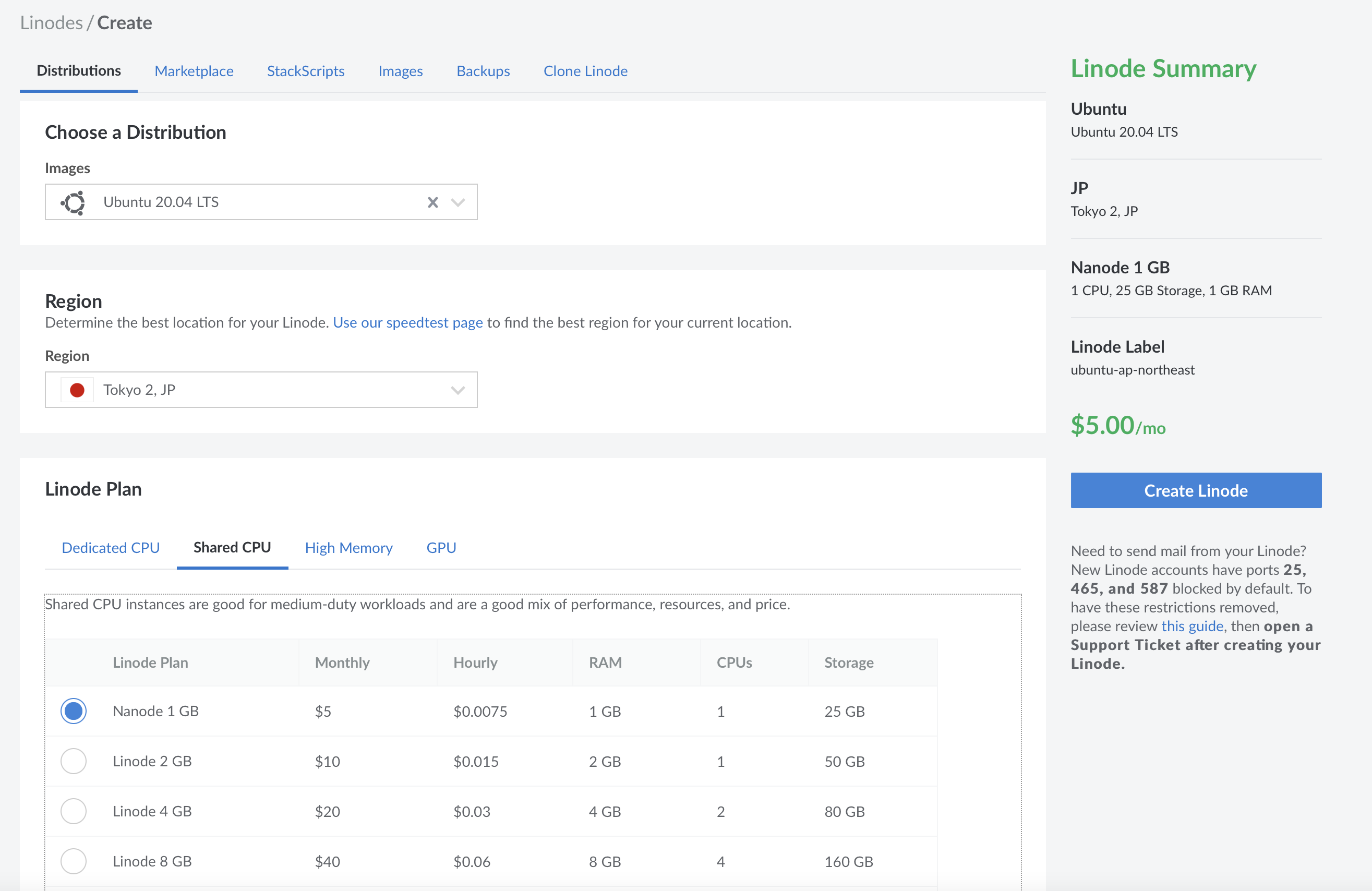 저는 각각 ubuntu 20.04 LTS 버전, tokyo리전, Nanode 1GB를 선택하였습니다.