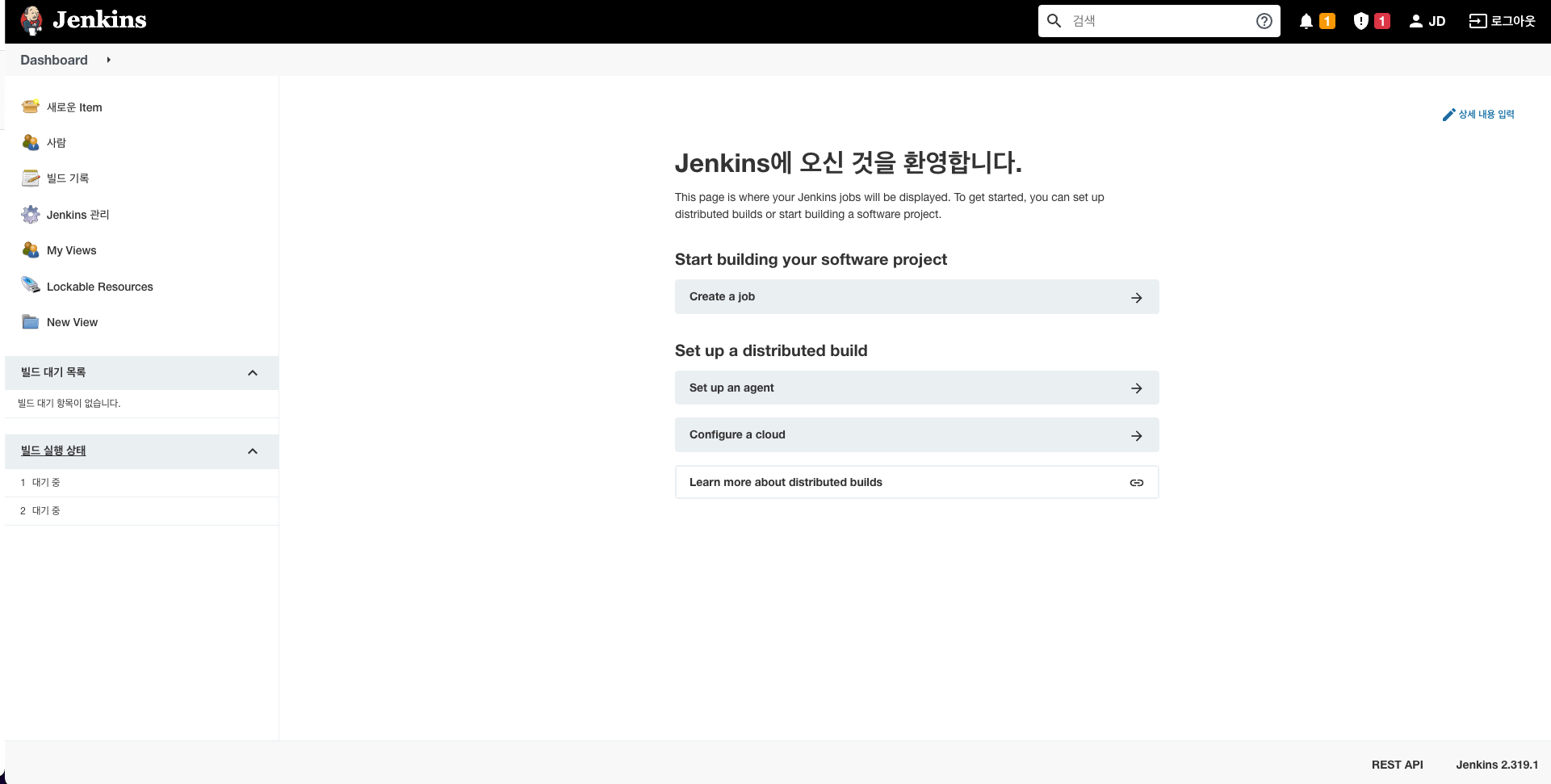 정상적으로 계정이 생성되면, 젠킨스에 초기 관리자계정으로 접속한 화면이 나오게 됩니다.