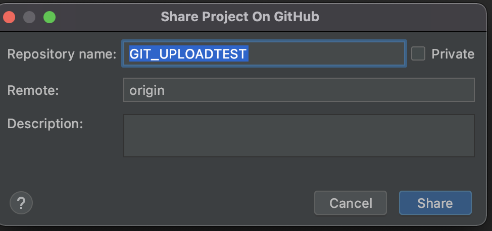 해당 팝업창에서 Repository Name과 깃허브에 작성할 정보를 알맞게 작성 후 Share버튼을 눌러주면 됩니다.