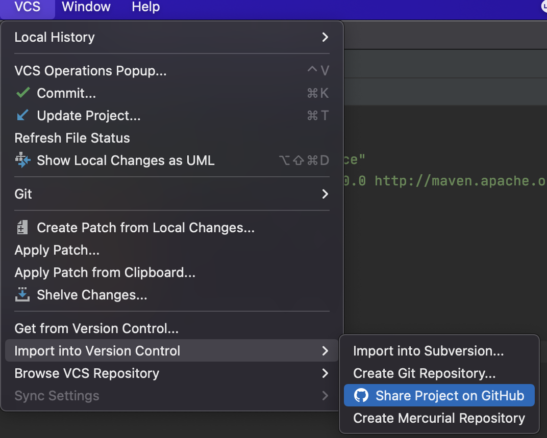 그 다음, 메뉴에서 VCS -> Import into Version Control -> Share Project on GitHub메뉴를 선택해 줍니다.