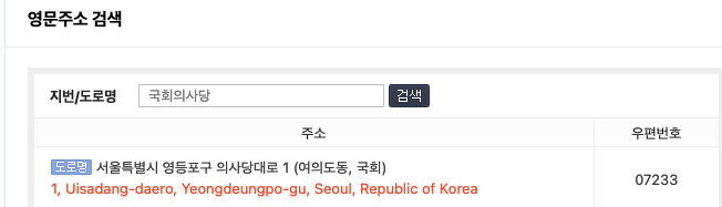 주소 정보를 이용할 때는 아래의 네이버 영문주소 검색을 이용하면 편하게 기입 할 수 있다.