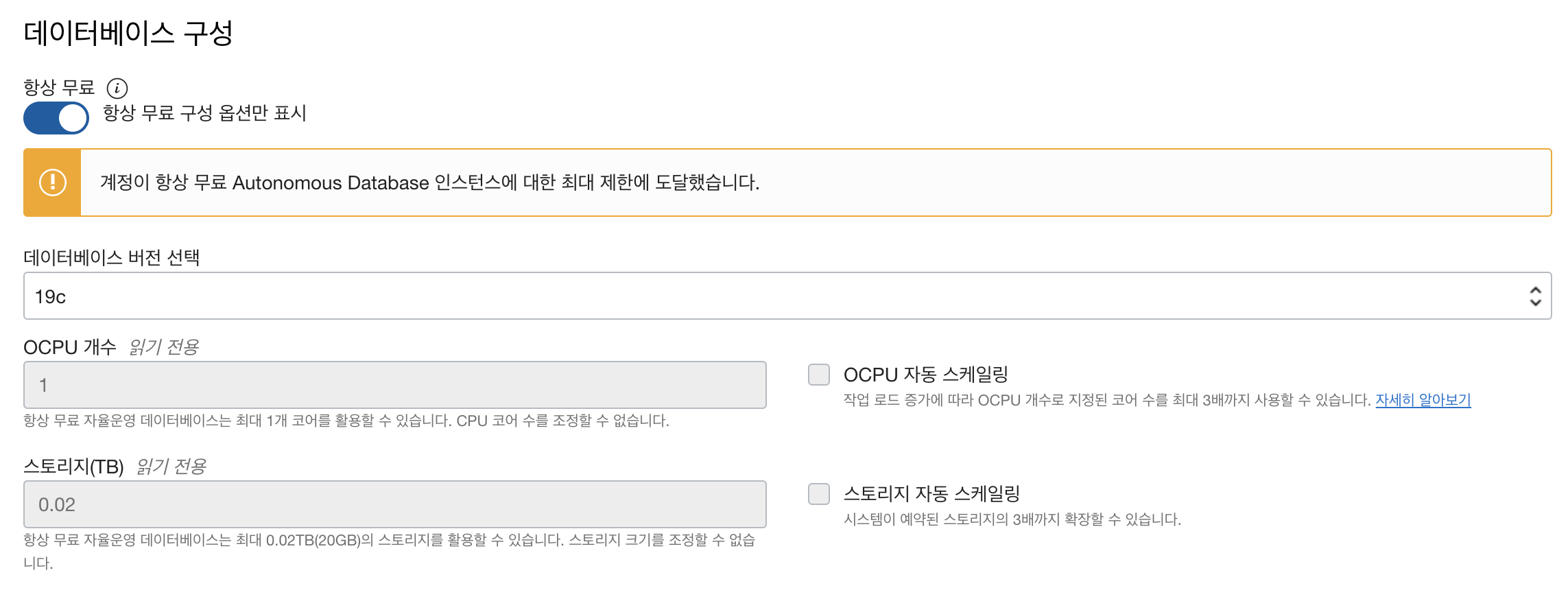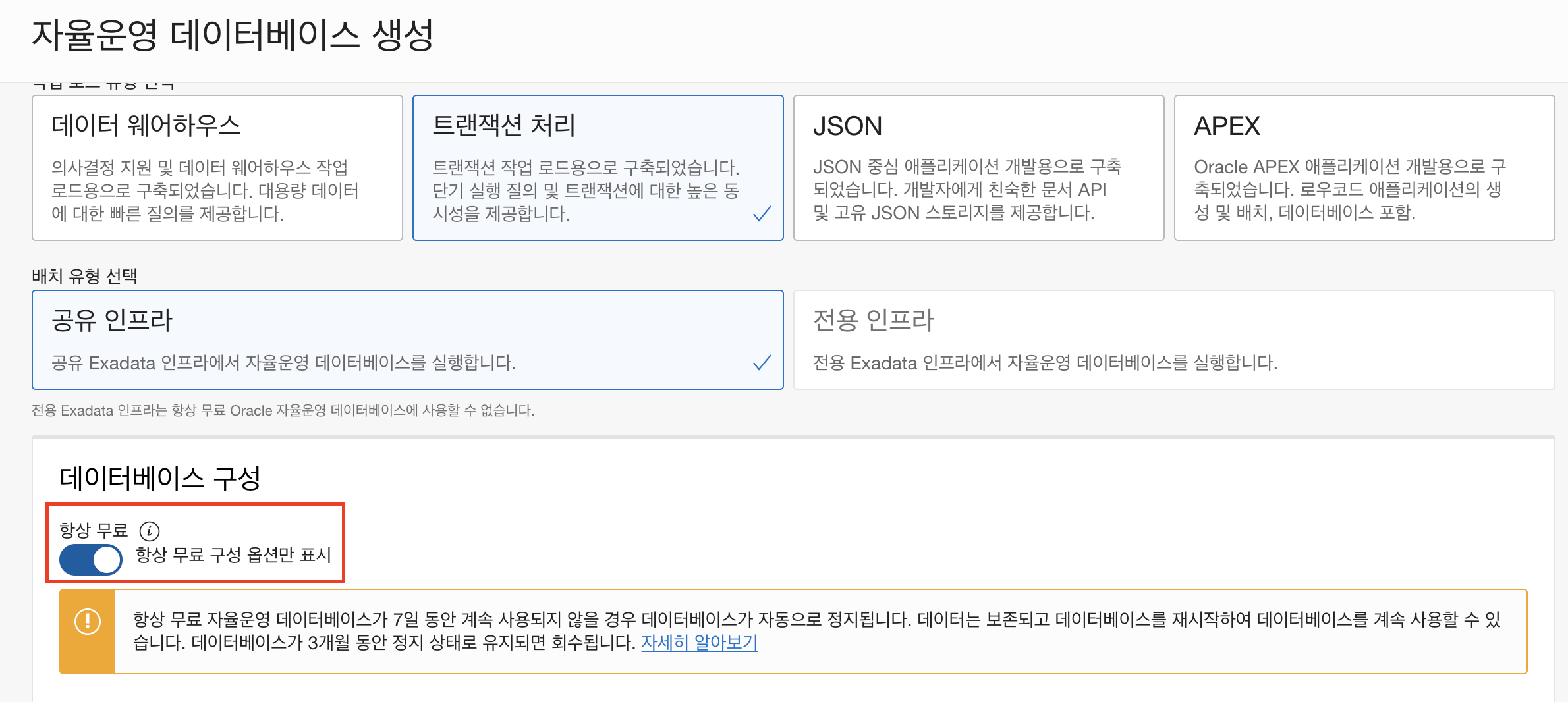 메뉴를 선택하면 아래와 같은 자율운영 데이터베이스 생성 화면이 뜹니다.