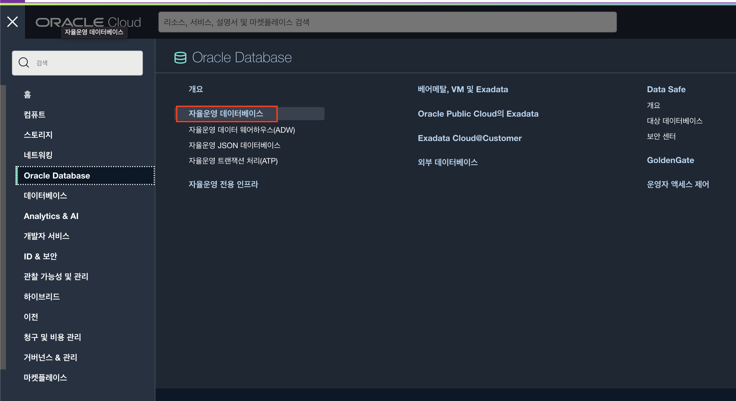 오라클 클라우드 메뉴에서 Oracle Database -> 자율운영 데이터베이스를 선택해주면 됩니다.