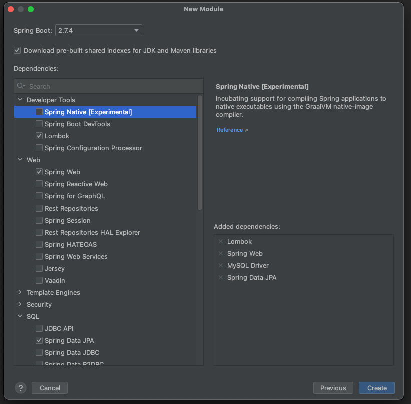 Lombok, Spring Web, MySQL Driver, Spring Data JPA를 선택해준다.