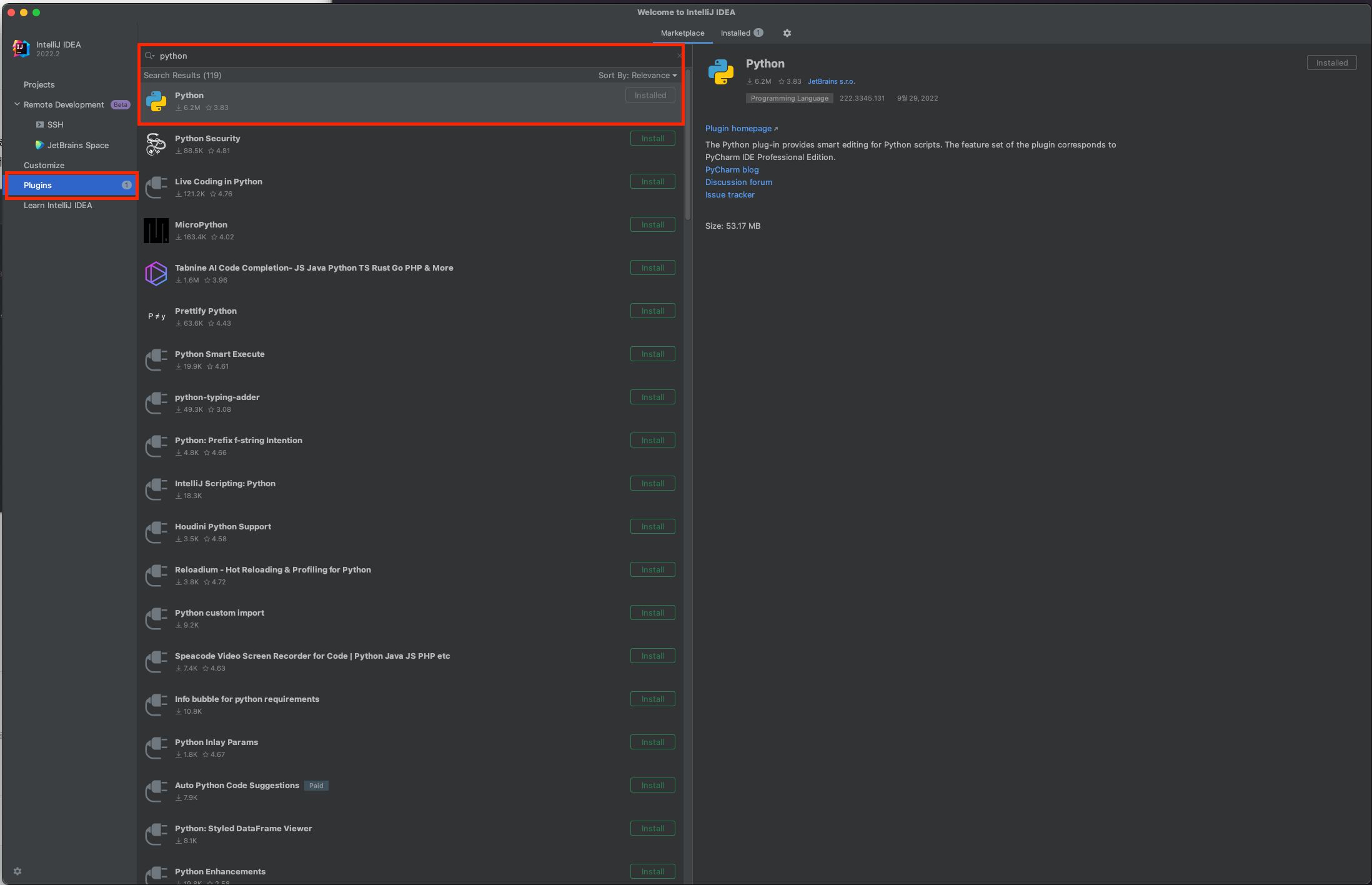 인텔리제이에서 파이썬을 사용하기 위해서는 플러그인 설치를 해주어야 합니다.
