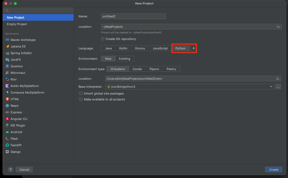 설치가 완료된 후, New Project를 이용하여 프로젝트 생성창을 띄워보면 아래와 같이 Language부분에 Python이 추가된 것이 보인다.