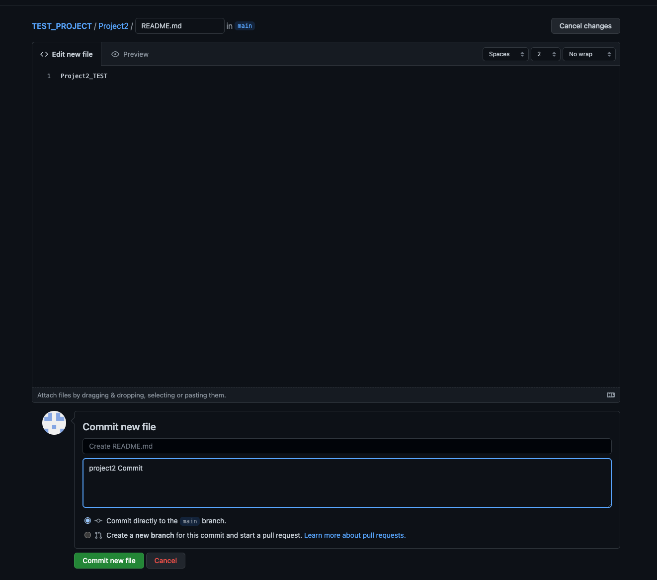 위와 같이 Project2/README.md 경로를 입력하여 주고, 나머지 정보들을 입력 후 Commit new file을 클릭해줍니다.