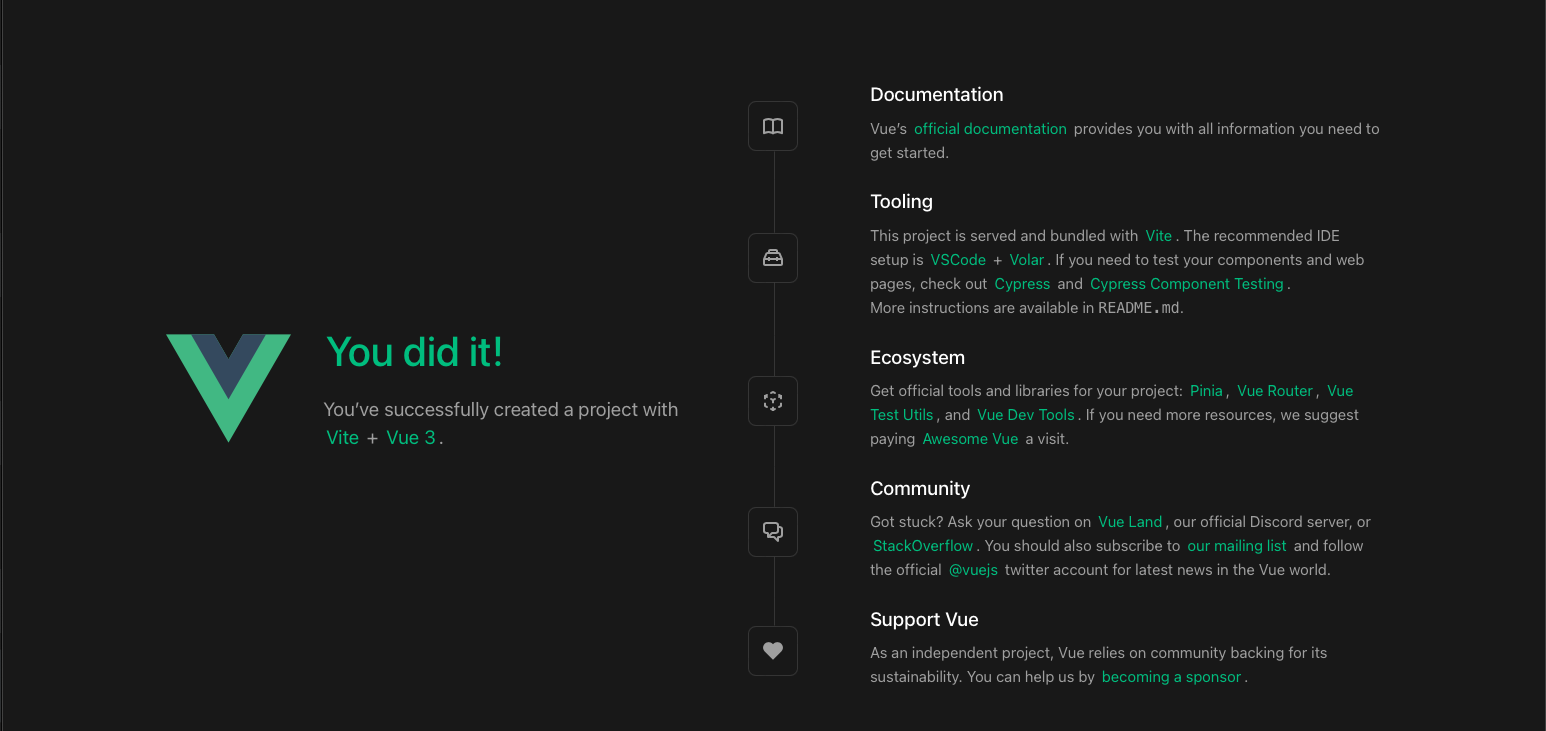 위와 같이 기본페이지까지 확인이 됬다면, Vue3 프로젝트의 기본세팅이 모두 완료되었습니다.