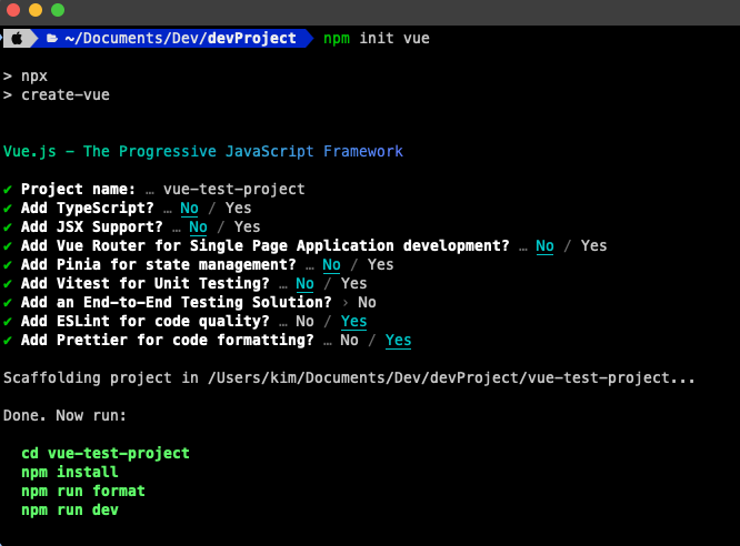 터미널에서 프로젝트를 생성할 폴터 위치에서 npm init vue 명령어를 입력해주면 해당 위치에 vue 프로젝트가 생성된다.