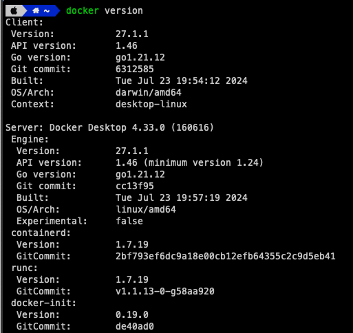 터미널에 도커 버전확인 명령어를 입력하여 정상적으로 설치되었는지 확인할 수도 있다.
