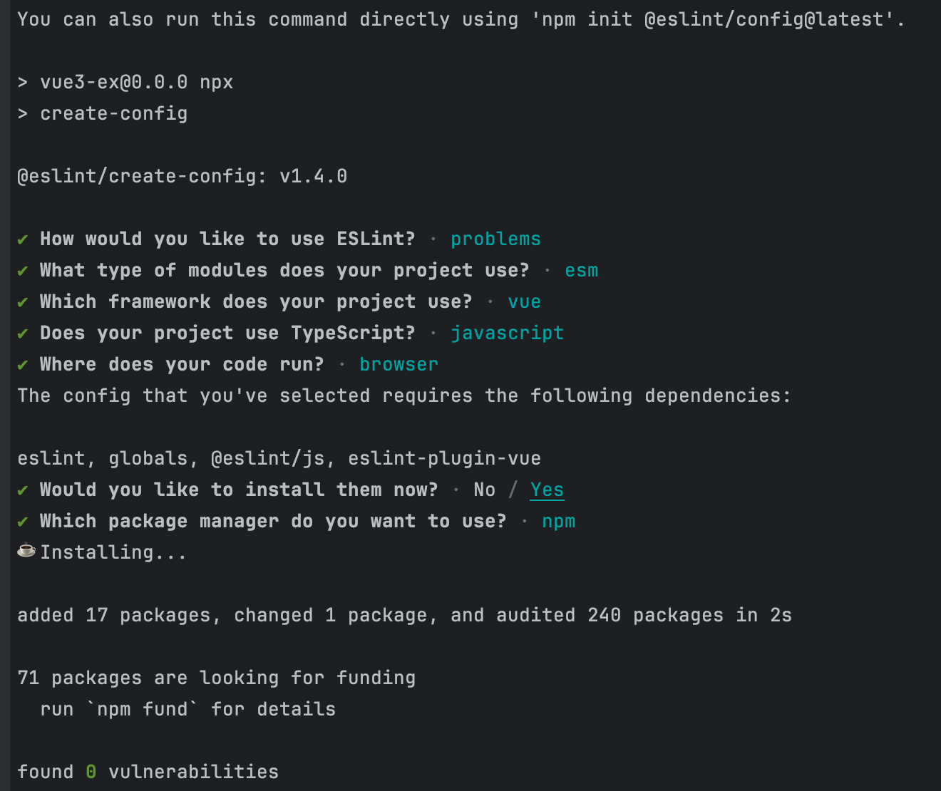 ESLint초기화 명령어를 실행하면 아래와 같이 단계별로 옵션을 선택해야 한다.