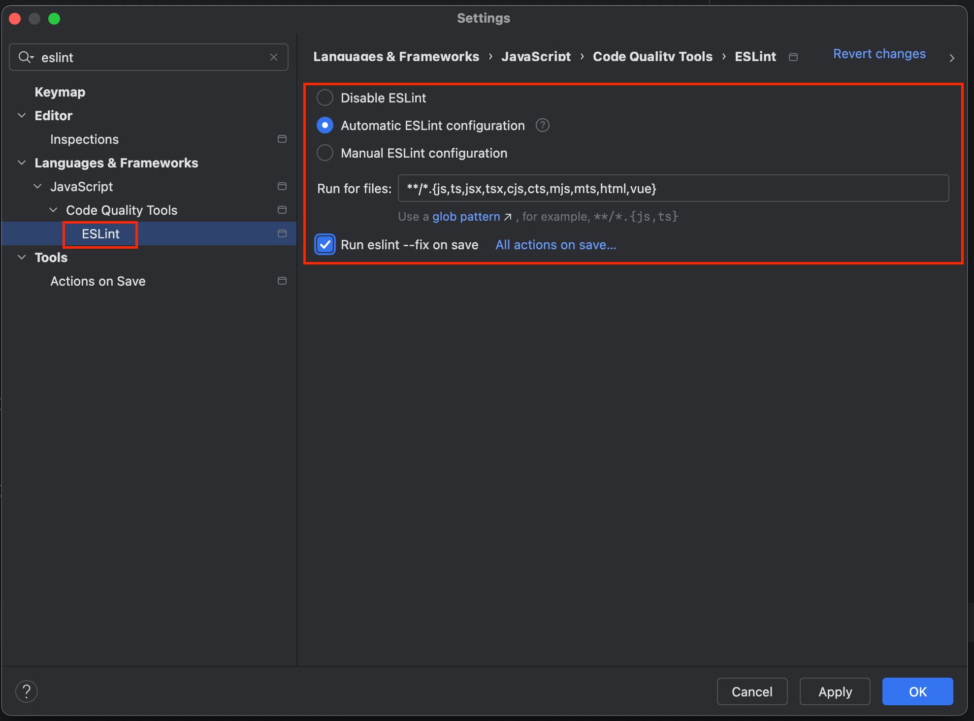 Intelij 세팅(Setting)에서 ESLint를 검색해서 ESLint를 설정해주면 된다.