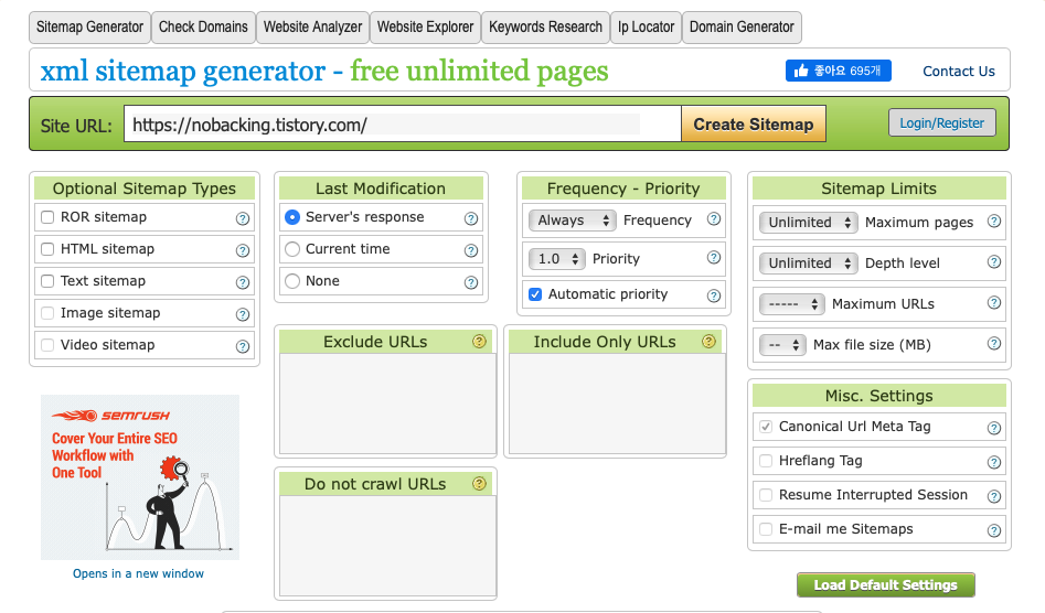 우선 Site URL을 입력해주고, frequency 셀렉트박스를 Always로 선택해준다음 Create Sitemap버튼을 클릭해줍니다.
